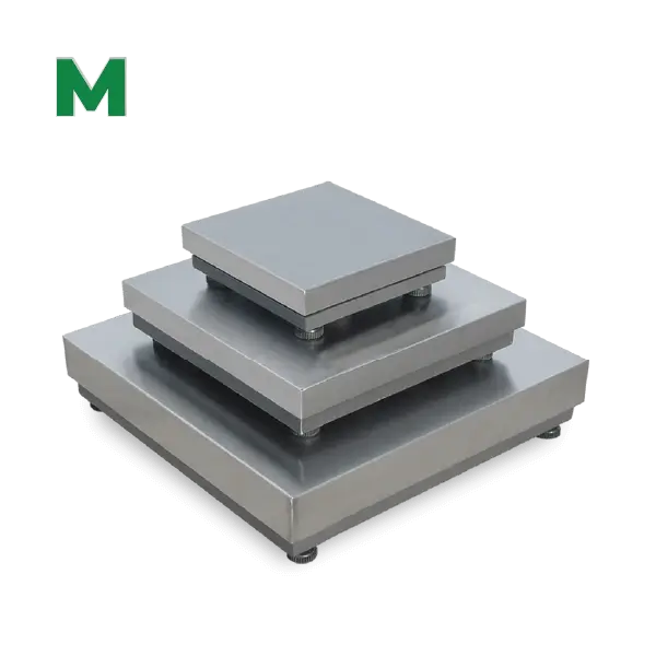 Plataforma monocélula – Estrutura tubular em aço, prato em aço inoxidável e célula em alumínio, IP65. Pés reguláveis em altura. Células de carga com certificado de ensaio OIML R-60 C3.